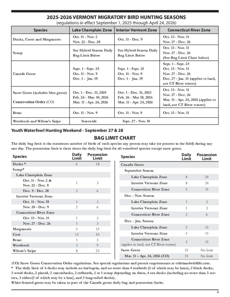 Details on this year’s waterfowl hunting days are given in the “2025-2026 Syllabus of State and Federal Hunting Regulations for Migratory Birds in Vermont” that is available HERE.
